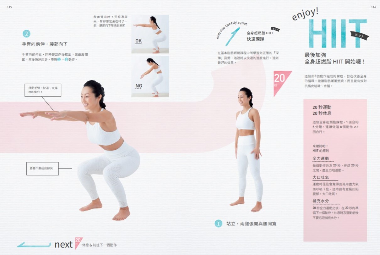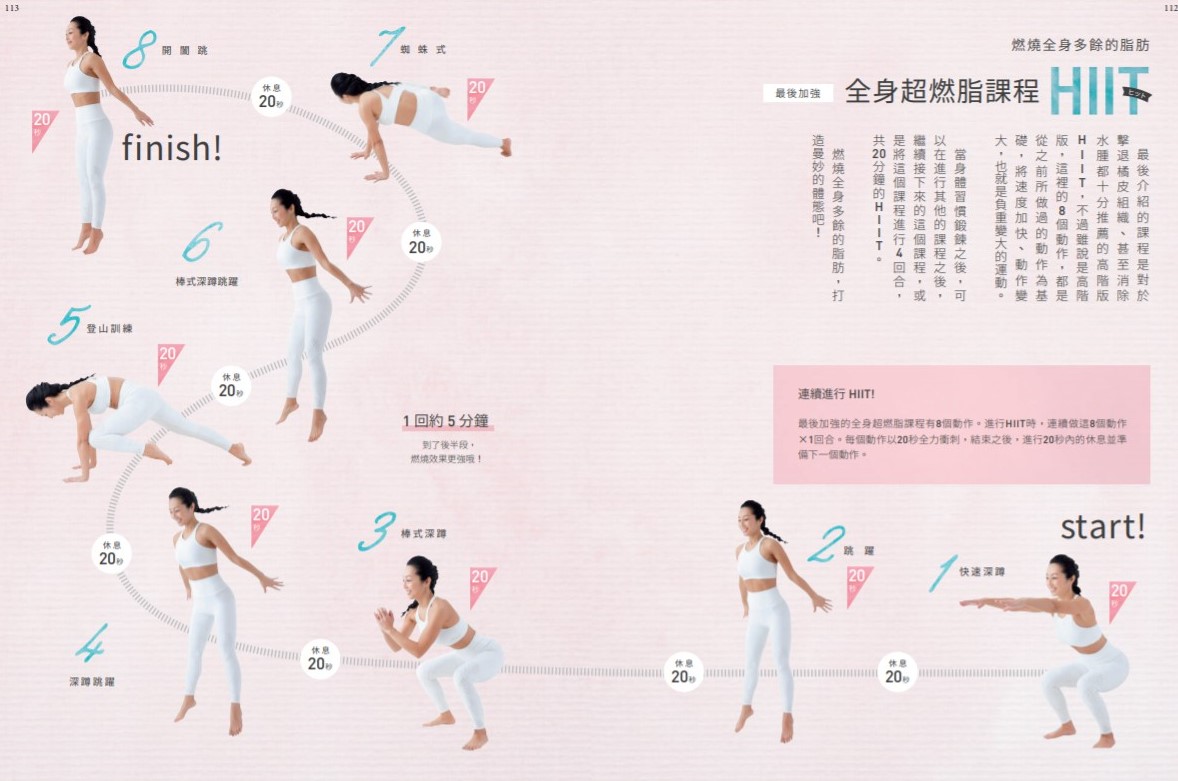 最後介紹的課程是對於擊退橘皮組織、甚至消除水腫都十分推薦的高階版HIIT,不過雖說是高階版,這裡的8個動作,都是從之前所做過的動作為基礎,將速度加快、動作變大,也就是負重變大的運動。當身體習慣鍛鍊之後,可以在進行其他的課程之後,繼續接下來的這個課程,或是將這個課程進行4回合,共20分鐘的HIIT。燃燒全身多餘的脂肪,打造曼妙的體態吧!