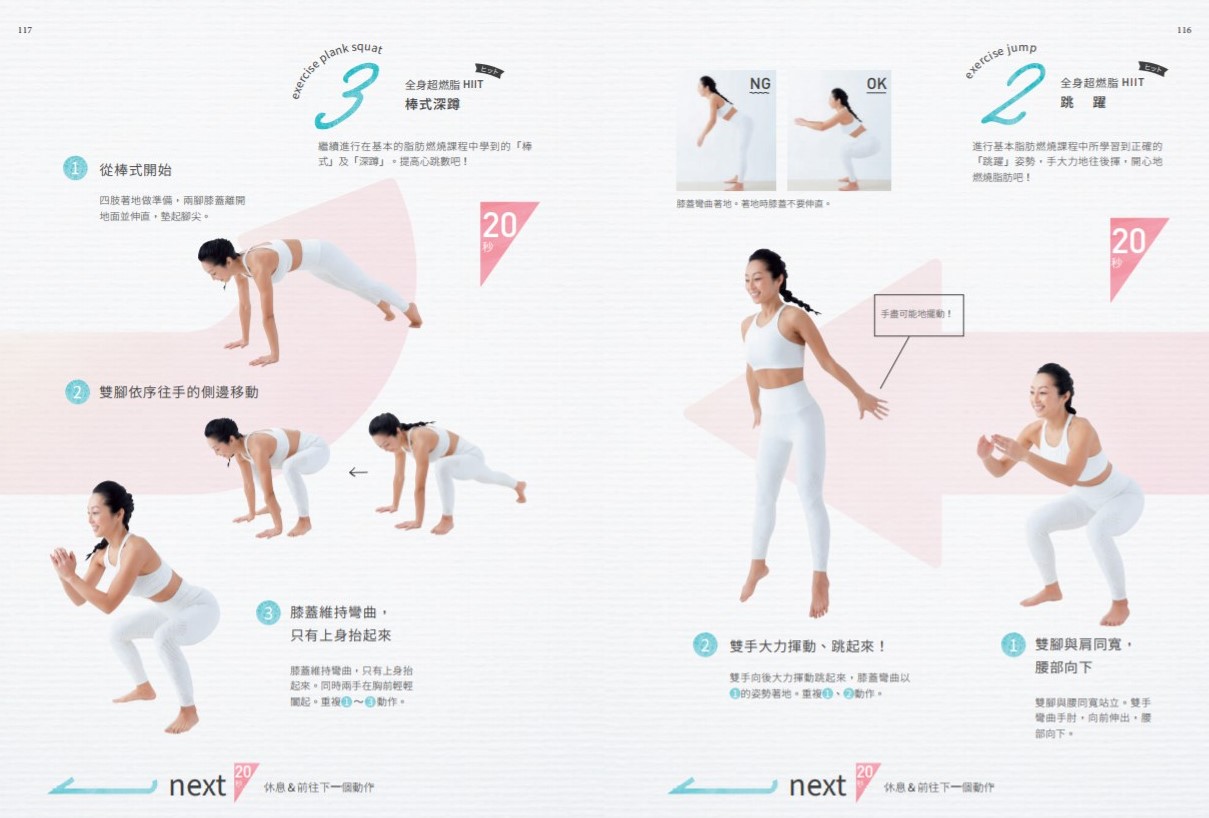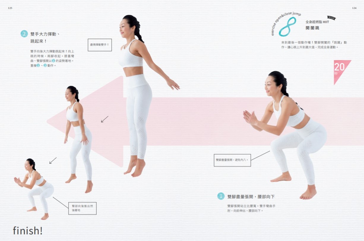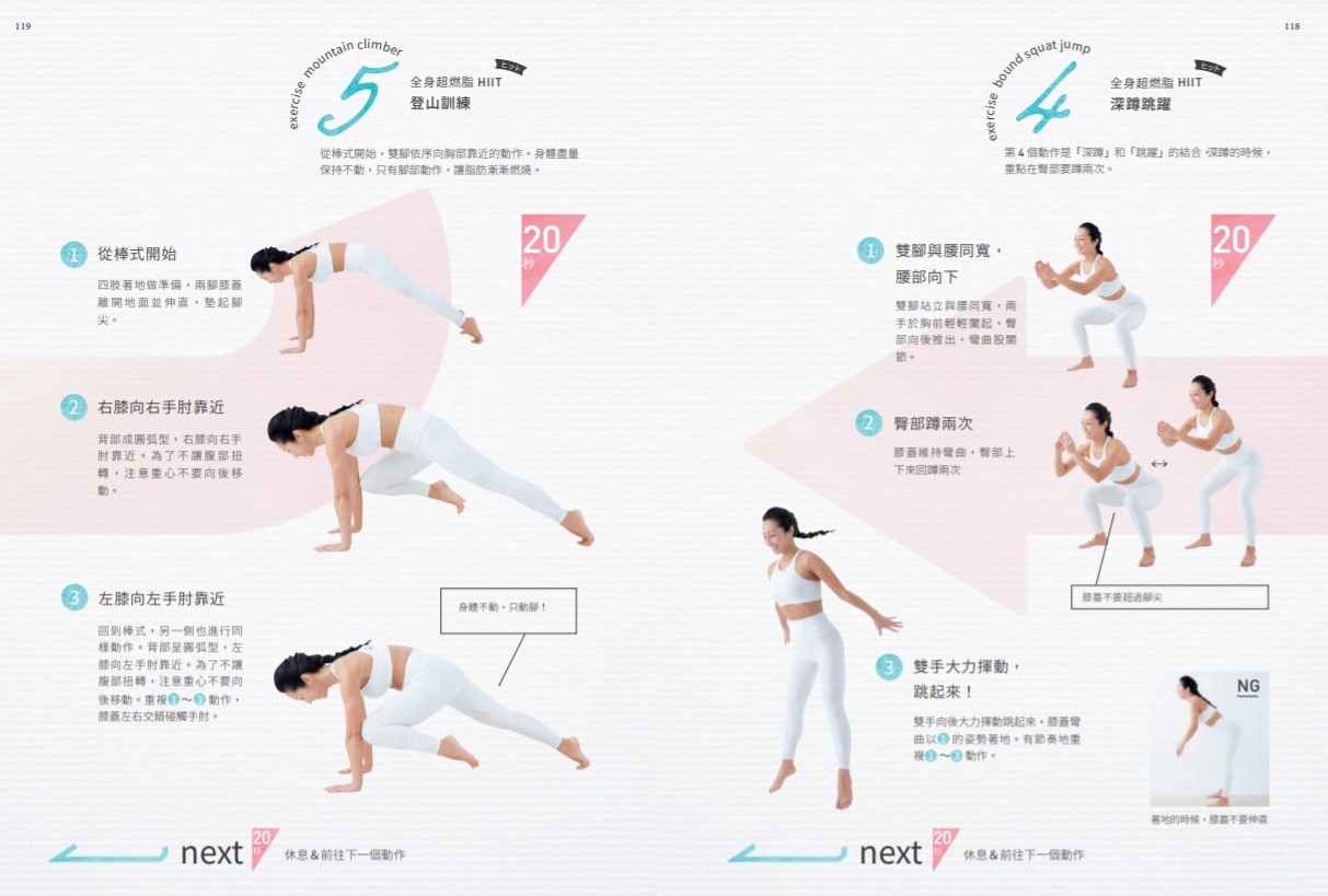 最後加強的全身超燃脂課程有8個動作。進行HIIT時,連續做這8個動作×1回合。每個動作以20秒全力衝刺,結束之後,進行20秒內的休息並準備下一個動作。