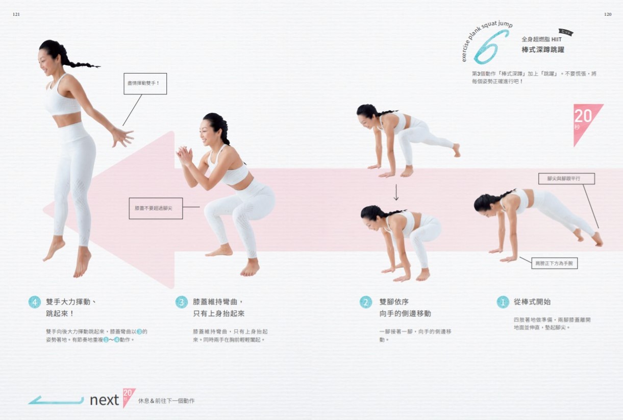 第6個動作「棒式深蹲」加上「跳躍」。不要慌張,將每個姿勢正確進行吧!