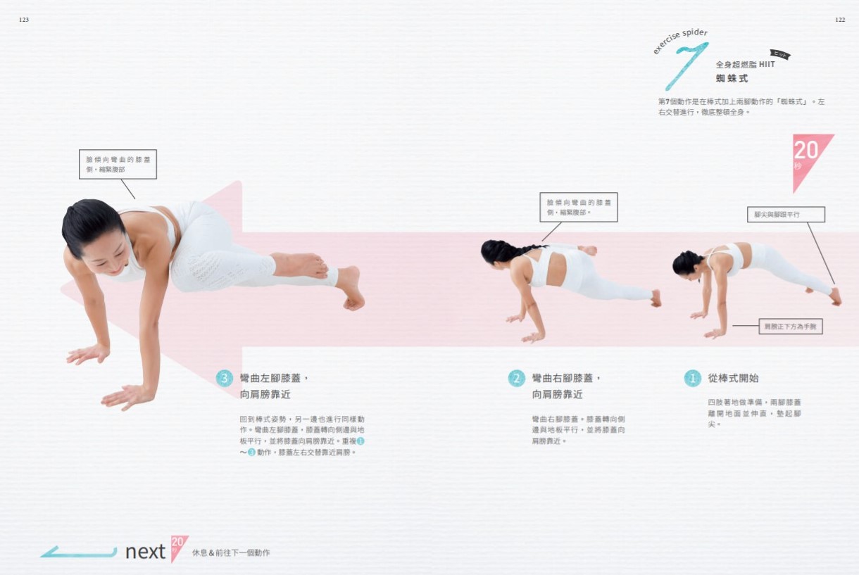 第7個動作是在棒式加上兩腳動作的「蜘蛛式」。左右交替進行,徹底整頓全身。